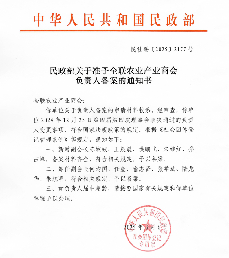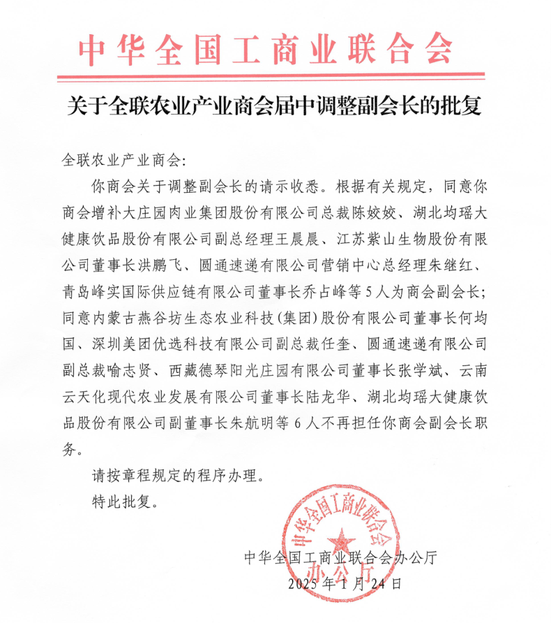 在大會(huì)正式召開之前,全國(guó)工商聯(lián)農(nóng)業(yè)產(chǎn)業(yè)商會(huì)還召開了第四屆第四次理事會(huì)、第七次常務(wù)理事會(huì)暨第九次會(huì)長(zhǎng)辦公會(huì)。會(huì)議匯報(bào)了2024年商會(huì)工作情況及2025年工作計(jì)劃,并審議通過了新增及調(diào)整副會(huì)長(zhǎng)人員名單,分支機(jī)構(gòu)成立的申請(qǐng)和論壇活動(dòng)管理制度等事項(xiàng),并傳達(dá)全國(guó)工商聯(lián)沈瑩書記一行調(diào)研商會(huì)時(shí)的講話要點(diǎn)。大莊園集團(tuán)總裁陳姣姣當(dāng)選全國(guó)工商聯(lián)農(nóng)業(yè)產(chǎn)業(yè)商會(huì)副會(huì)長(zhǎng)。